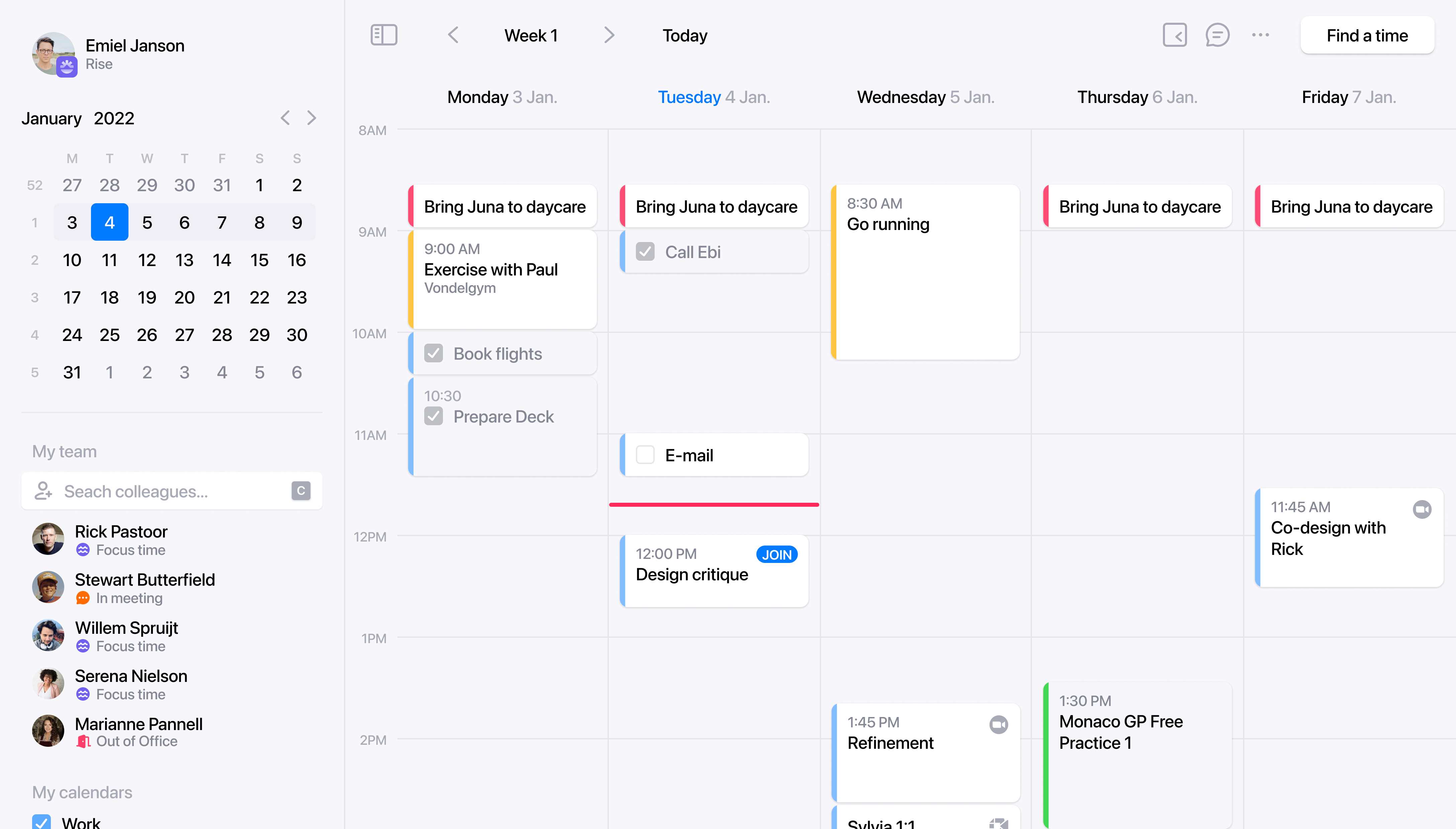 Rise checks availability, Blueprints, preferences and dozens of other signals for all attendees. Rise finds a time that works for everyone and maximizes time to focus.